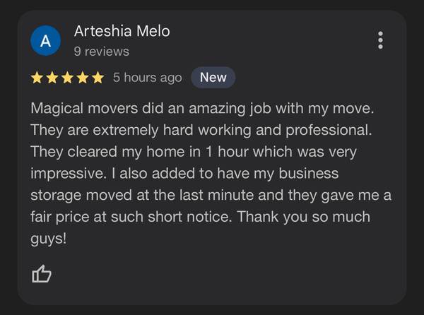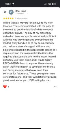 My name is Jacques with magical movers We’ve been in business for 3 years. We specialize in moving, junk removal, furniture delivery, LONG DISTANCE, Hottub moves and etc. We’re dependable, trustworthy, and reliable. Our main focus is customer service and making sure our customers are 100% satisfied with the move! As you can see our work in the pictures and also different reviews from customers on yelp and thumbtack platforms. You can view more on google, instagram, facebook at “magical movers”