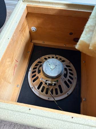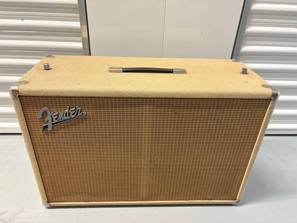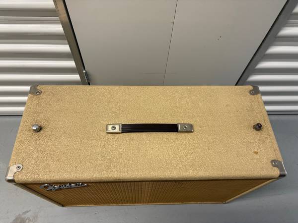 1963 Fender Blonde 2x10 tremolux piggyback cabinet with the thumbscrews and tilt back legs. Cabinet is in pretty good overall shape but the original owner had put their name on the back and some one painted over it with a semi matching color as pictured. Speakers are Oxford 10K5-4 and all original insulation is present. $750 possible trade for a deluxe reverb reissue.