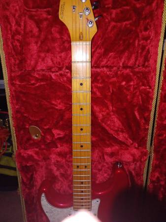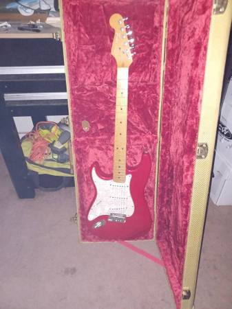 1989 american fender candy apple stratocaster lefty left handed. great condition. replaced pick guard/backplate. otherwise original hardware pickups etc. great condition. 1100.