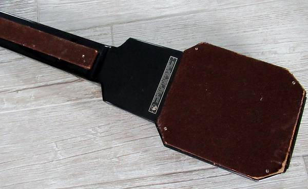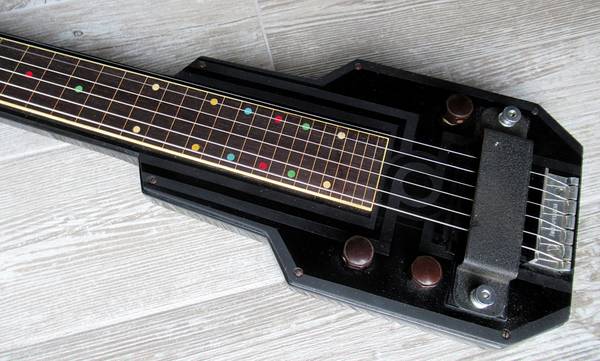 This stunning art deco designed Model M was Epiphone's first deluxe electric steel guitar. Made in the mid to late 1930's, it features an ornately etched metal faceplate on a solid black painted wood body all designed, according to reference books, to simulate a New York skyscraper at night! Complete with the original pickup which still works AND the original case. Case handle is broken.