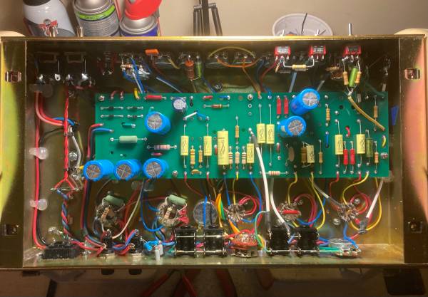It’s modified 2203/4 preamp is married to a 6V6 power section for ~20 watts of tube power. It’s mounted in a super-portable lunchbox style head cabinet, with a few extra’s built in to add to its versatility. Includes NOS and premium components.