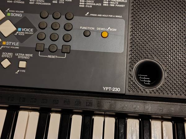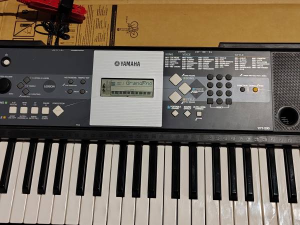 I'm selling a YPT-230 Keyboard Yamaha 61 Keys with Power Cord. It's in good used condition overall and works fine. Some cosmetic scratching and marks throughout (see pictures). Comes with Keyboard...