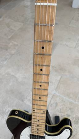 Beautiful Jay Turser Tele guitar in great condition. Black gloss finish with pearloid pickguard and maple neck and fretboard, gold finish hardware. Setup action is low. Frets smooth.