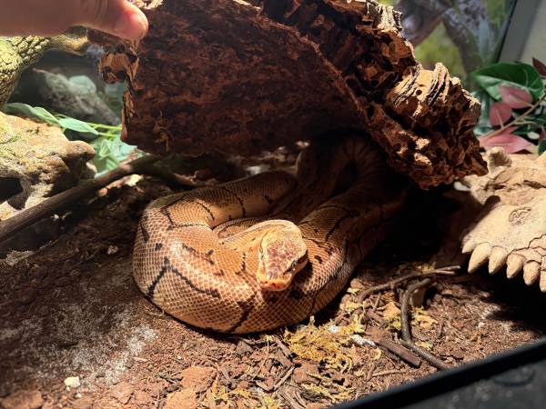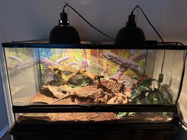 Have an older ball python super sweet and easy handling for Rehome asking 200 for everything to include 40g front open exp terra zoo med style tank enclosure for reptiles with locking front doors no chips, cracks or warps. Also have the food/bowl, substrate and aquarium terrarium decor and heat lamps with domes and have frozen feeders that can go with. Any questions please let me know trying to find her a new home asap.