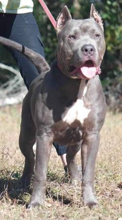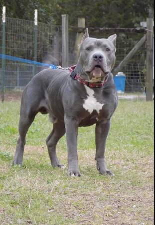 Dog: purebred Standard American Bully, grey with white chest, has papers.