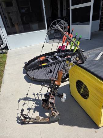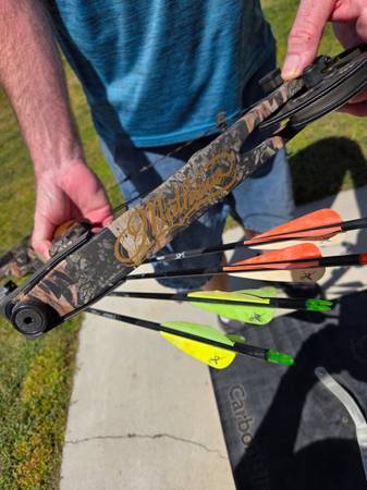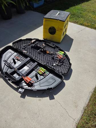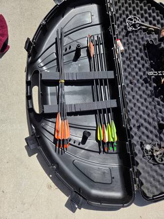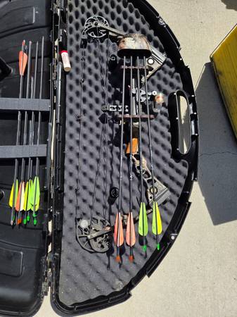 Matthews Outback hunting bow with 17 arrows, carry case, and target block included. Right-handed bow with release. Minimum use, ready to sell.