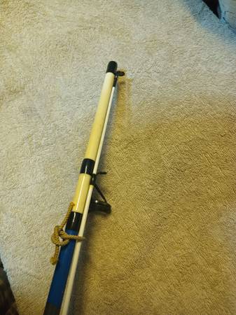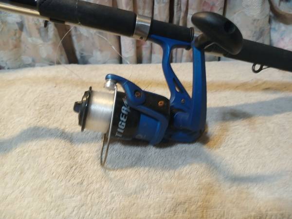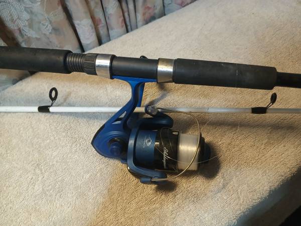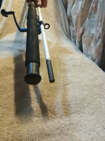 Medium action , 2 piece Guides in good shape, tuff rod tip guide Reel- bail flips , bearings ok, bail bearing moves,