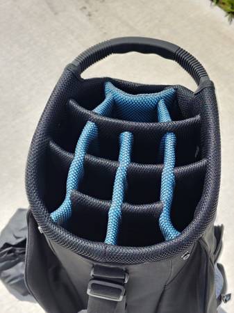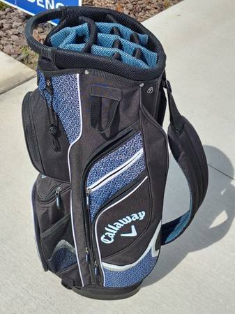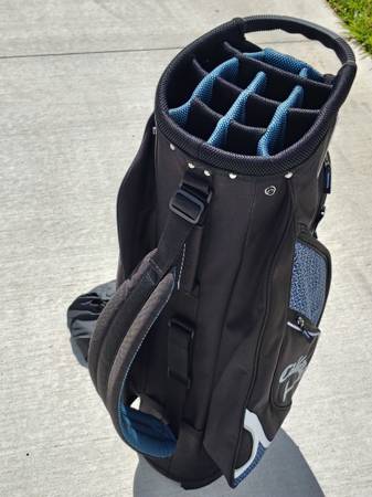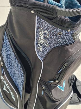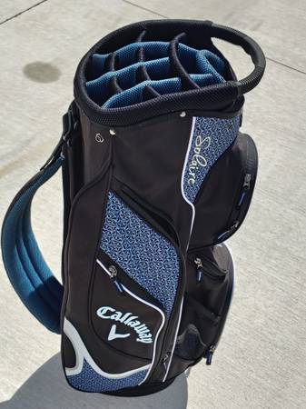 I'm selling a Callaway Solaire Cart Bag 14 Way with Hood Cover. It's in good condition and works fine. All zippers tested and work. Rain hood cover included. See pictures.