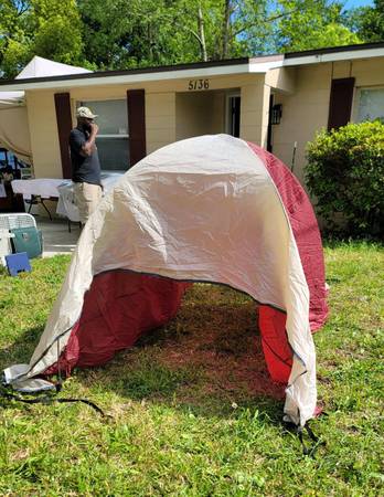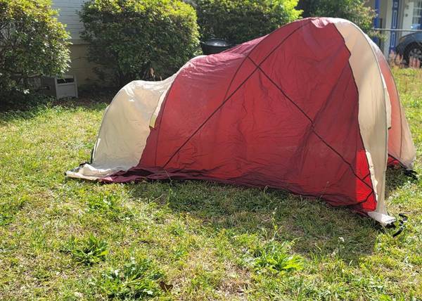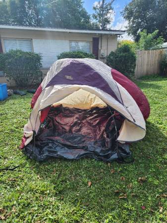 Great Basin By Quest 6 Person Tent. Foldable 5 fiber glass poles. Great for long weekend camping. Folds down for easy storage in the bag. Light weight. Beige and Maroon in color.
