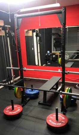 Rogue Yoke Squat Rack With Spotter Arms Barbell Bumper Plates