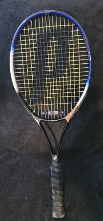 Vintage 1980’s Prince Tech Titanium Comfort Grip Synergy Tennis Racket with Case. Blue & White in color.