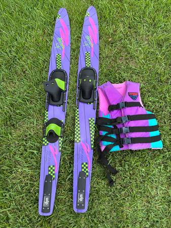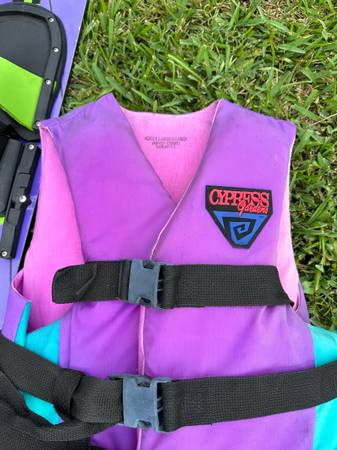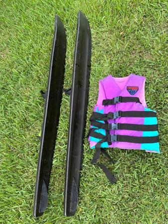 Pair of America’s cup water skis with cypress garden L/XL ski vest.