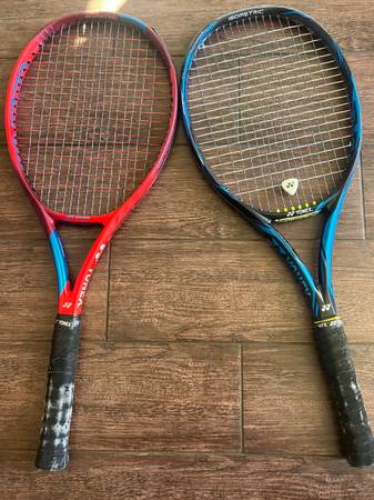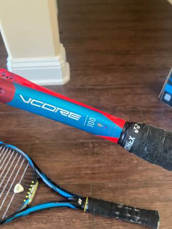 Yonex racquets in good condition. Purchased both new from Go Pro Tennis about 3-4 years ago. V Core 100 and Ezone 100; paid $230 for each. Both have hybrid string setup for enhanced topspin and durability. Also included is a 2 racquet Yonex bag and 5 new cans of Dunlop balls. I am phasing out of tennis due to injury. Priced to move quickly. $150