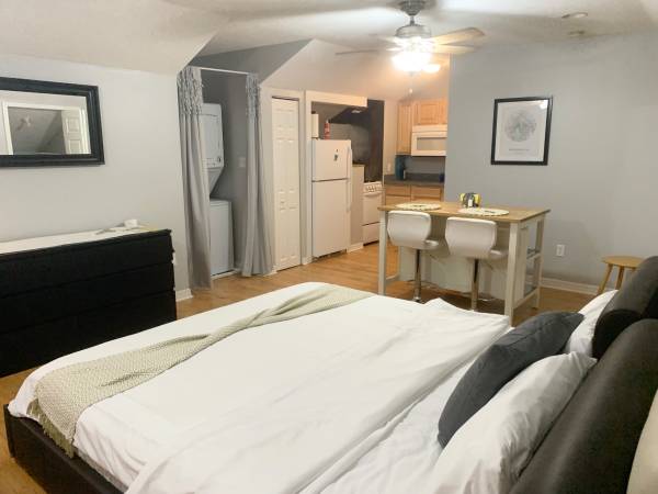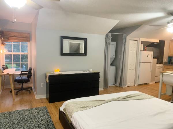 This studio sits above the garage which is a separate building from the main house. Complete Privacy from Main House on 4 acre property.