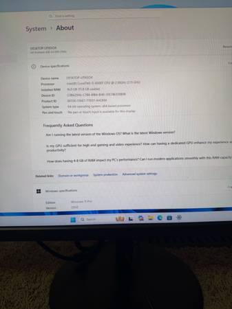 For sale i5 HP ProDesk 600 G4 DM ultra thin desktop computer. Comes with the ultra thin tower, 24” ultra thin frameless widescreen LCD monitor, keyboard, mouse and all power cords. Windows 11 pro 64 bit with the latest updates, intel core i5-8500T 2.11GHZ 8th Gen processor,upgraded to 16GB DDR4 memory ram, 256GB M.2 solid state Hard drive, 6 USB Ports plus USB-C, dual Display port, built in WiFi, built in Bluetooth. Everything has been tested and works great. We accept Cash, Cash app,Apple pay, Google pay,Zelle and credit cards. Comes with a 30 day warranty. Serious inquiries only.