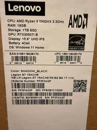 I Have a Lenovo Legion gaming laptop for sale used in box. I’ve owned it for a few years now, but have upgraded to a desktop and no longer need. It works great, comes with Windows 11 home edition, has 16 GB of RAM, one terabyte storage, a Ryzen 9 5900HX, 3050 TI Nvidia Graphics card & a 165Hz Display. Also has an extra slot for an additional ssd and upgradeable ram up to 64G $550.00 OBO if its up its still available, Will mark sold or delete when gone.