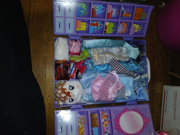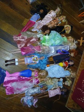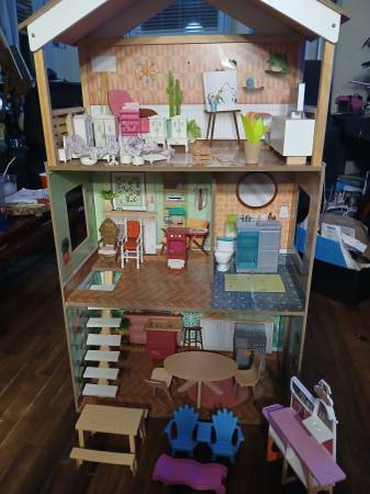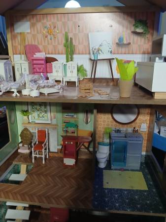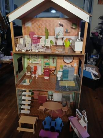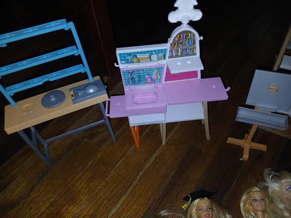 Beautiful Doll House scaled for Barbie dolls, furniture, Barbie sets and accessories, several Barbie dolls, horse for Barbie. Closet with clothes. Barbie Tractor and more. Tried to picture it all. Please text and only serious local buyers need contact me. *NO SCAMMERS*