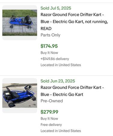 2 Razor Ground Force Drifter Go Karts One has been garage kept. One has been under a trap outside. 2 chargers included. Extra NEW wheels. Both need new batteries. Bought used, my kids never showed...