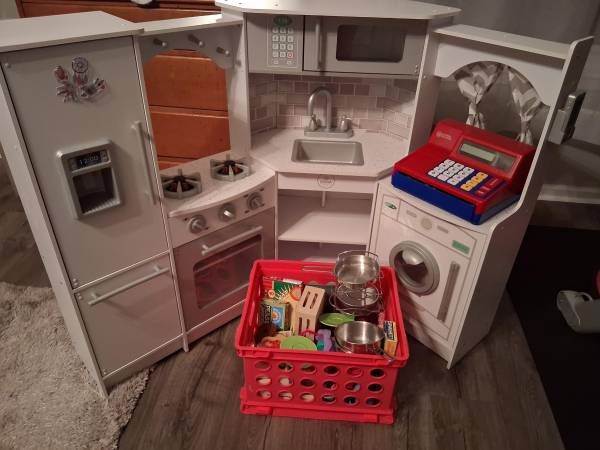 Gently used kids' kitchen with accessories and play cashier. The ice cube maker makes noise, and the burner light and sound come on when pressed.