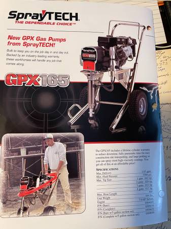 Retiring (at 80) and selling equipment. SprayTech GPX 1.65 gallon per minute Gas piston pump, airless paint and viscous coatings sprayer. I have sprayed small and large commercial metal and non-graveled asphalt based roofs The sprayer is capable of spraying water, oil and solvent based liquids including elastomerics, up to 300 feet away and has 4 gun capability. The 7 horse power gas engine is made by Subaru starts easy. All parts and maintenance items are available here in the USA from Titantool.com. The owner's manual pictured shows GPX 130 but is applicable for the GPX Series.