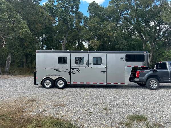2020 Double D SafeTack Reverse 3-horse trailer gooseneck with side ramp, dressing room, and full insulation. Z-frame construction, 7'8 tall, 96 wide, 18' box. Rumber flooring, SafeBump roof, padded slant dividers, dual loading options, drop-downs on head and butt side, walk-through door, full lighting, fans, folding step, bridle hooks, blanket bar, saddle racks, and more. Upgraded to 6K axles, 16” tires, aluminum wheels, and hydraulic jack. Loaded with top-tier options.