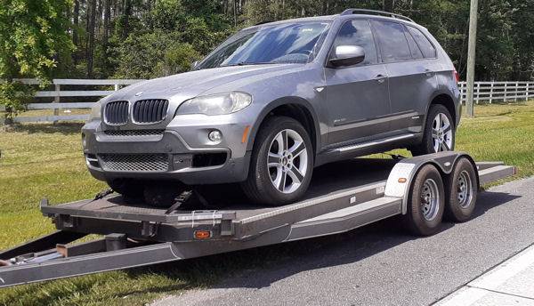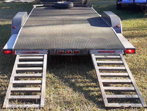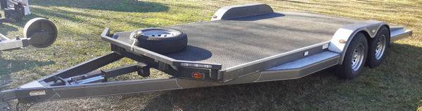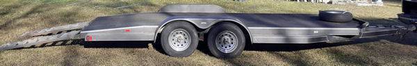 7' x 18' Hauler with 68"L x 22"W Hidden Ramps, 6'11"W between wheel wells (83") x 18'6"L, Dual axles, Electric Brakes, steel decking with Slide-Out Steel Car Ramps, Crank Jackstand, 2” receiver, round 7-blade hookup for the lights. Great to haul your Car, Truck, Dually Pickup, Slingshot, Weight--1880 lbs, GVWR-8000 lbs. RENT FOR $95 daily (NO MILEAGE FEES)