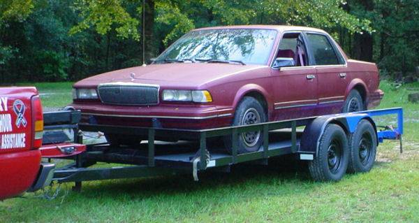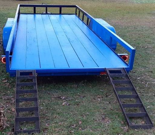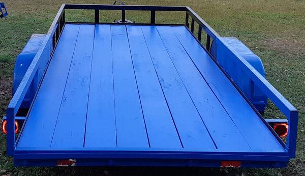 6' x 16' open trailer, 6’4”W (76") x 16’L, with 12.5” steel sides, 2" x 8" wood decking, Dual 3500 lb axles, with 2 Heavy Duty Steel Car Ramps, 2”x3”x1/4” Heavy Duty Angle Iron Frame, Crank Jackstand, 2” receiver, 4-pin hookup for the lights, Weight--1575 lbs, RENT FOR $75 daily (NO MILEAGE FEES)