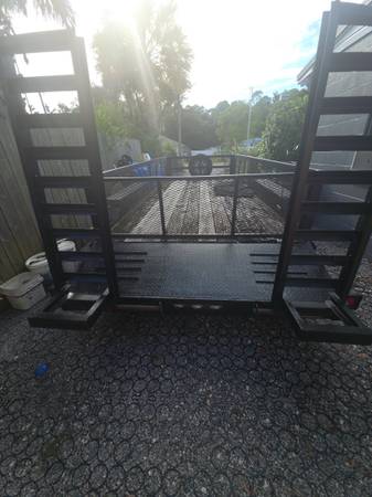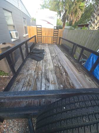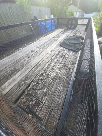 18 feet dovetail. 16' long x 6'8" wide feet flat portion. It has removable sides and back. Can carry 10+ cubic yards of mulch. Has 2-7000lb axles with brakes. 2-5/16 ball mount. Can easily replace with ring & pintle style. Rated to 14000 lbs capacity. Needs some new boards but usable now.