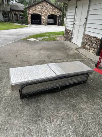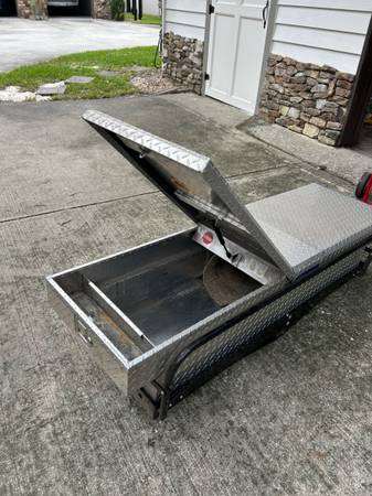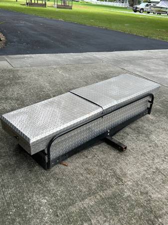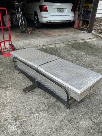 Well maintained hitch haul with attached tool box. Truck bed tool box can be separated. Note hitch haul has support side bars to help secure whatever your hauling. Key for locks.