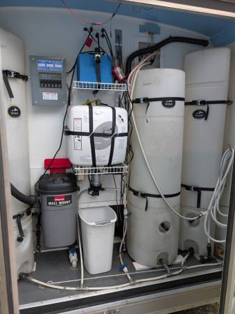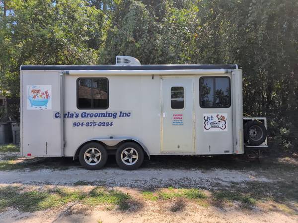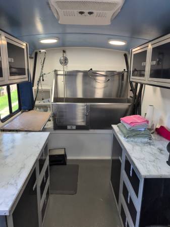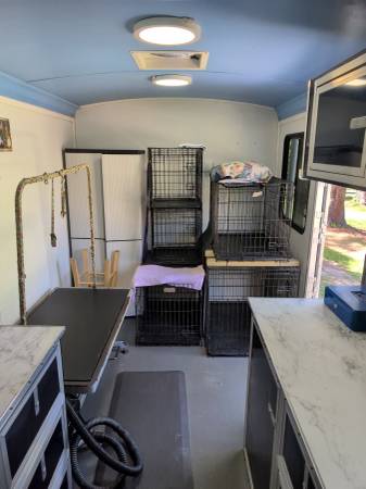 Well maintained, 18' long and specially designed for 2 groomers and a bather. Find a place to park so people can come to you or go mobile, it's fully self-sufficient. 3 water tanks holding 128 gallons of water and a brand new generator so you don't have to hook up at client residences. Has an extra large tub, an extra large hydraulic grooming table and a smaller stationary table, 5 cages (2 small, 2 med and 1 extra lg), 2 force dryers, 2 Andis Pulse ZR cordless clippers, various blades, shears, brushes, combs and everything you need including towels and shampoos and conditioners.