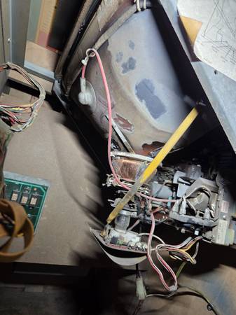 Machine powers on but has scrambled screen and I do not hear sound. Cabinet and screen have imperfections as shown in the photos.