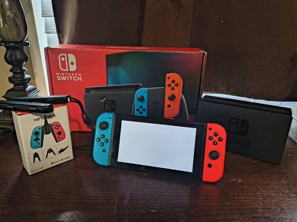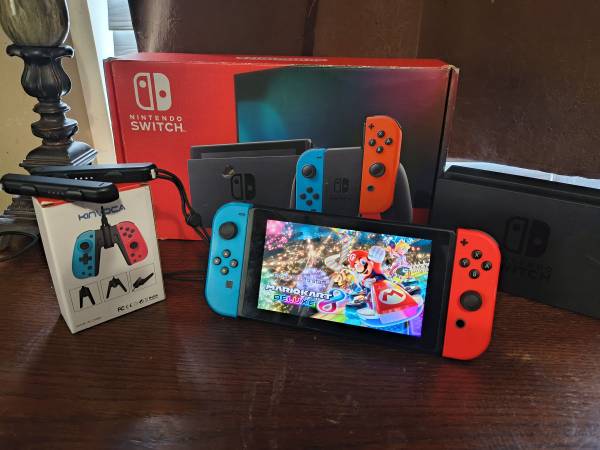 Mint condition Nintendo switch comes with super Mario kart deluxe 8 brand new charging control holder and docking station for gameplay on your TV and cords needed
