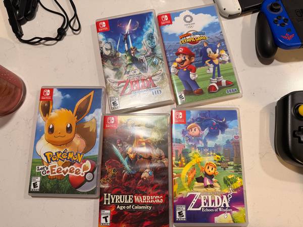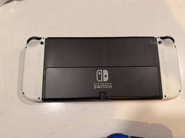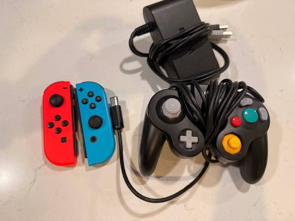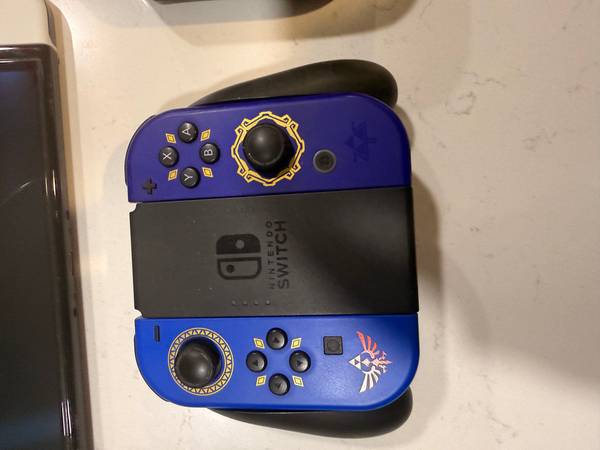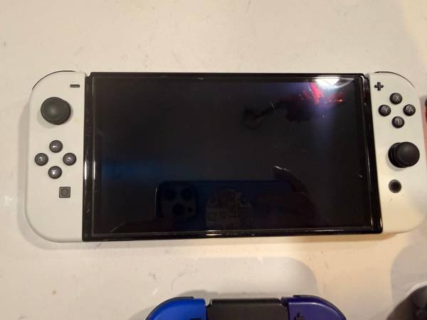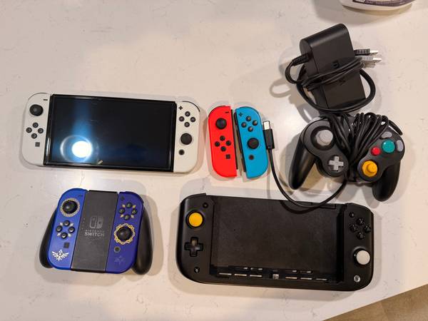 Nintendo Switch OLED system. It comes with A/C adapter, original white joycons, a set of zelda joycons, gamecube wired controller with Wii U adapter, programmable gamepad. Includes 5 games. It has an SD card already inside, with a total storage capacity of 351GB