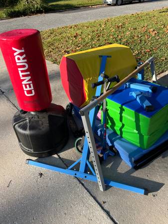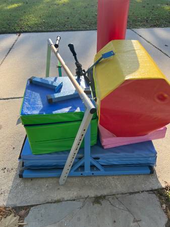Punching bag, scooters, gymnastics pads, gymnastics bar.