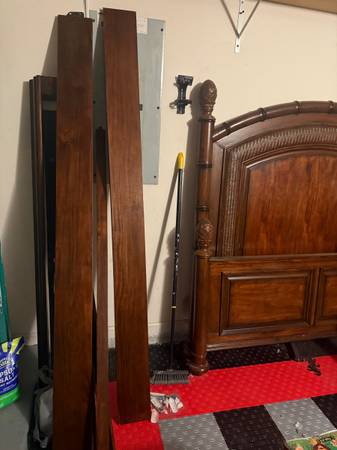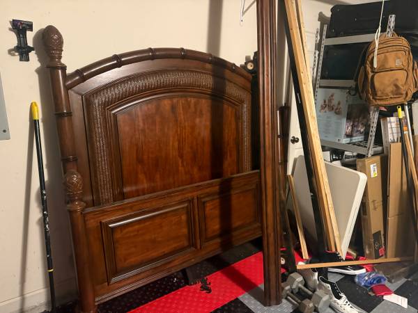 This was a nice Cindy Crawford queen bed. It’s been in the garage about a year. When I was dissassembkigg by it one of the bottom slats that hold the box spring broke, probably 3-8 or 3/16 by 8 feet, pretty easy to get. There’s a dent on the footboard. It’s nice tho. Free or best offer, you’ll need to pick it up either way.